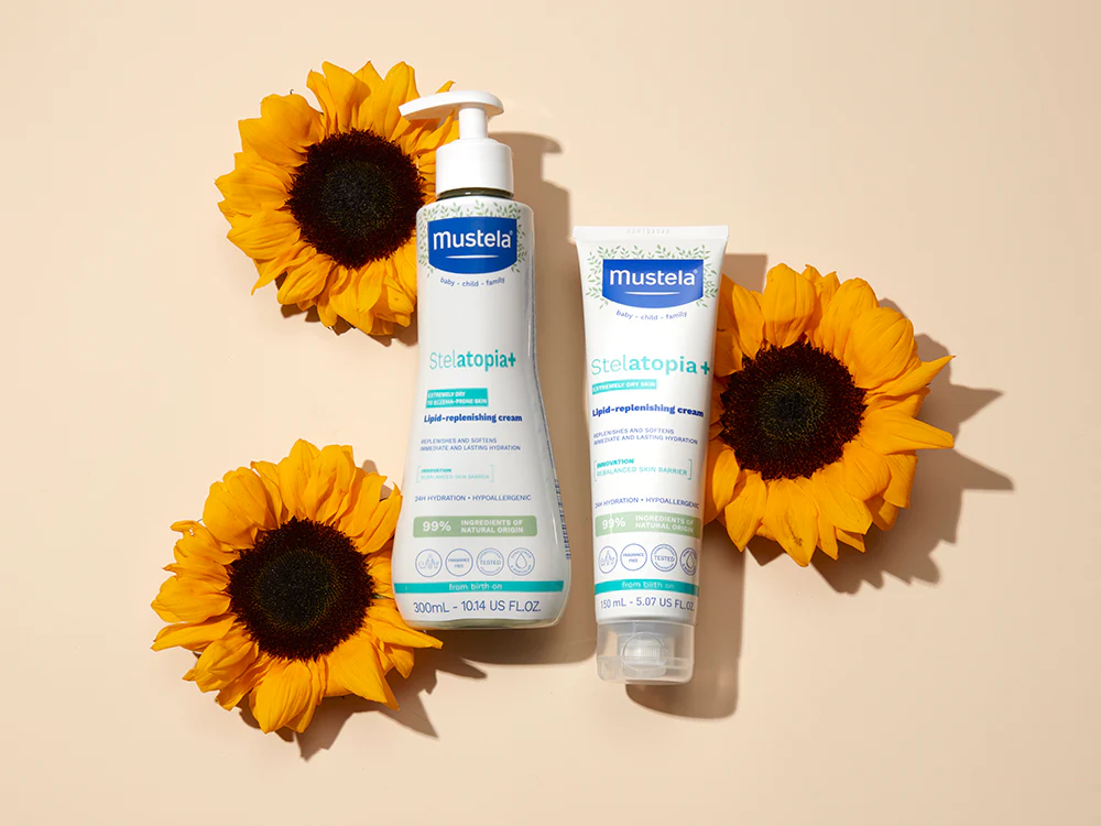 Stelatopia+ lipid-replenishing cream immediately and continuously nourishes and moisturizes extremely dry to eczema-prone skin for up to 24 hours. Fragrance-free and made with 99% ingredients of natural origin per ISO 16128 standard including Prebiotic Bioecolia® and Sunflower Oil Distillate, this cream strengthens and protects the skin’s moisture barrier and rebalances skin to relieve and prevent dryness. Formulated to be safe for newborns, children, and the whole family.
